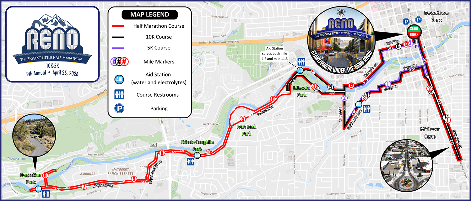 This premier course starts beneath the iconic Reno Arch and charges through the heart of downtown before heading into the vibrant Midtown District for a fast, colorful out-and-back. The route then winds through the tree-lined streets of Reno’s beautiful Old Southwest neighborhoods and followed by scenic stretches along the Truckee River bike paths, passing through several of the city’s beloved parks. With an exciting finish back through downtown and finishing under the Reno Arch, this course delivers the perfect mix of urban energy, neighborhood charm, and riverfront beauty.